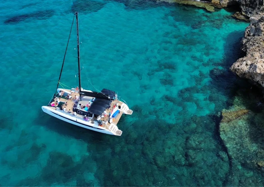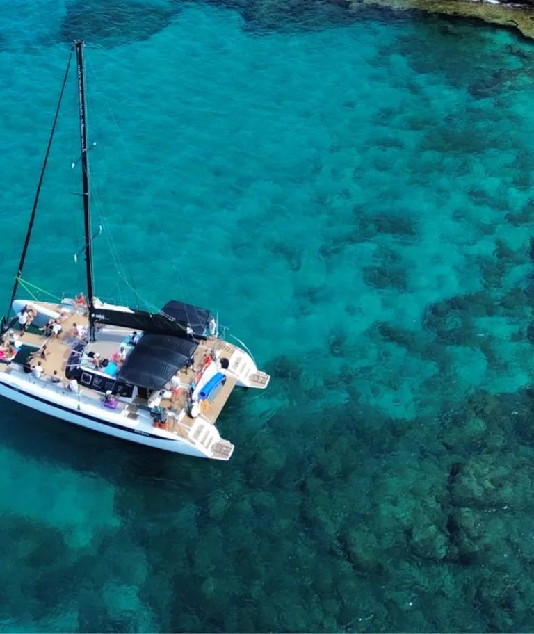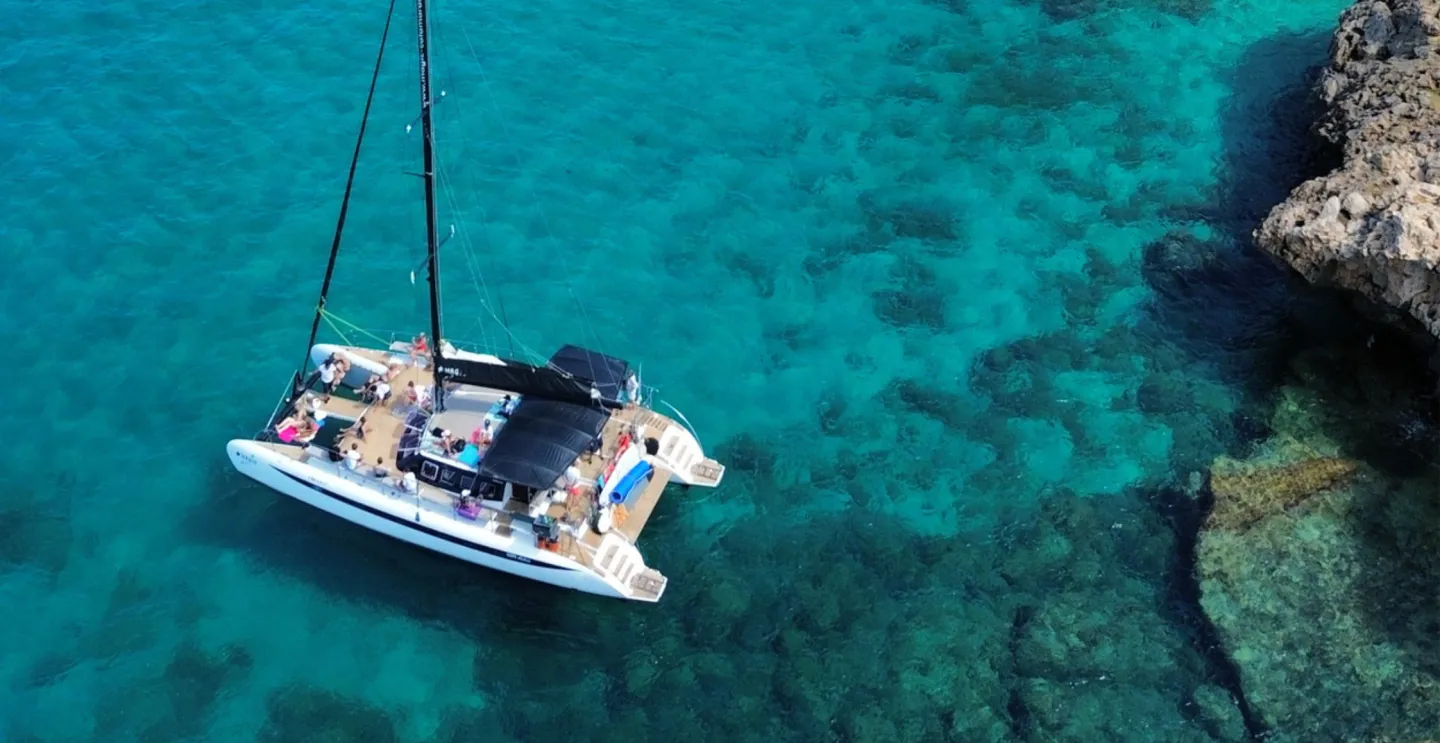 PROGRAMA E ITINERARIO: Exclusiva salida desde el puerto de Palma de Mallorca / Paseo Marítimo enfrente del Auditorium a bordo del catamarán MAGIC, con máximo 35 pasajeros en total. A bordo del catamarán MAGIC disfrutarás de una silenciosa y confortable navegación a vela o a motor hacia Cala Vella. Realizamos una primera parada en el impresionante Cap Rocat donde podrás disfrutar de un apacible baño y degustar un delicioso aperitivo. A continuación, navegaremos hacia Cala Vella, una idílica cala de aguas cristalinas donde te serviremos una deliciosa Barbacoa, preparada a bordo mientras te bañas y relajas en este precioso lugar. Volveremos navegando a vela sobre las azules aguas de la Bahía de Palma, podrás contemplar la impresionante catedral de Palma desde el mar, para finalmente llegar a nuestro punto de salida en el puerto de Palma, con sus espectaculares yates y cruceros.