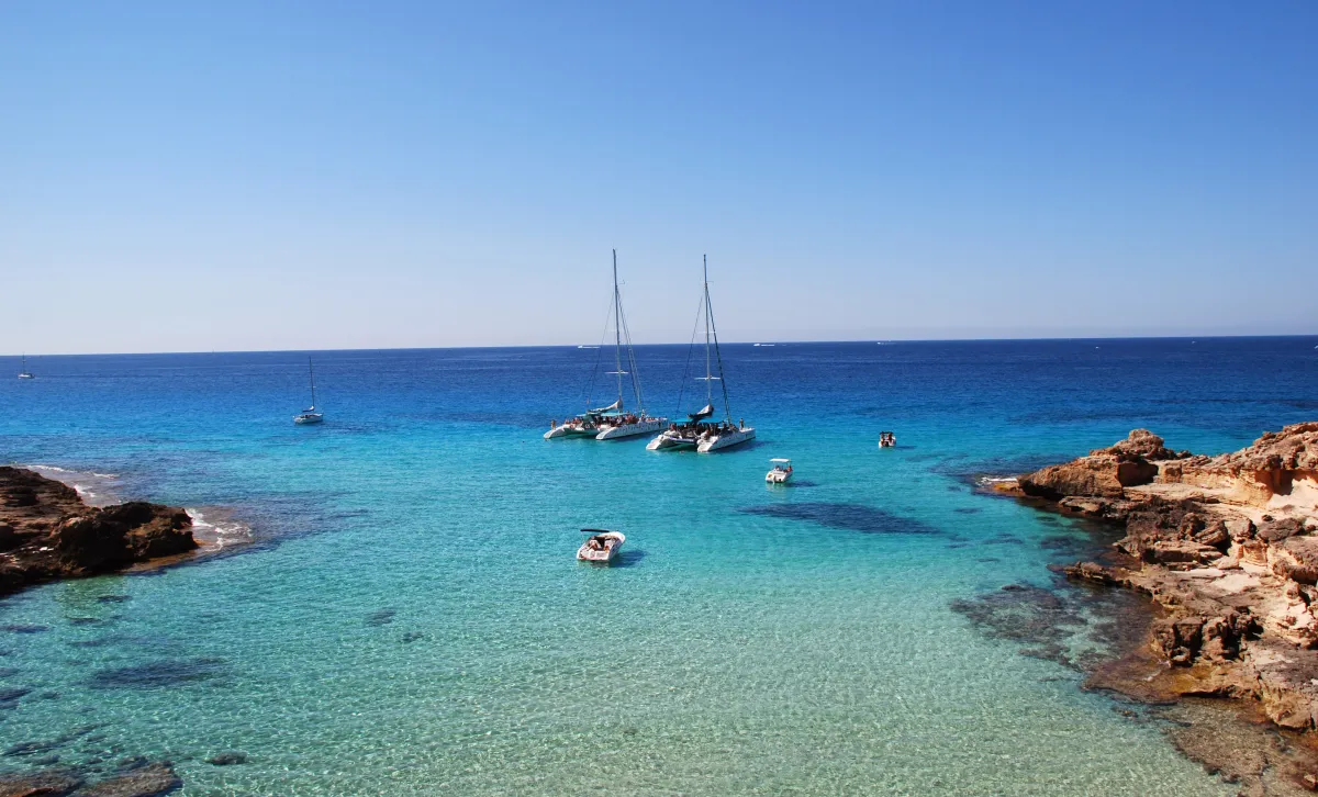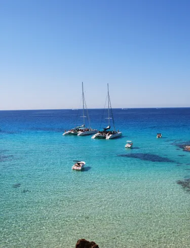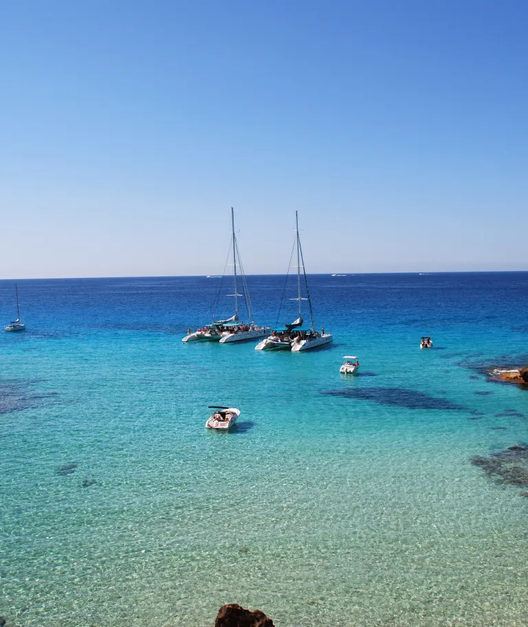 On board the MAGIC catamaran we offer you a tropical welcome cocktail while you accommodate. We sail silent and conformatbly in the Bay of Palma towards Cala Vella. We make a first stop at awesome Cova Verda cove...