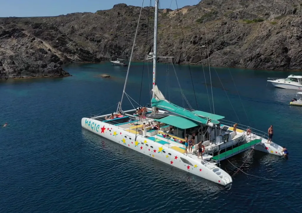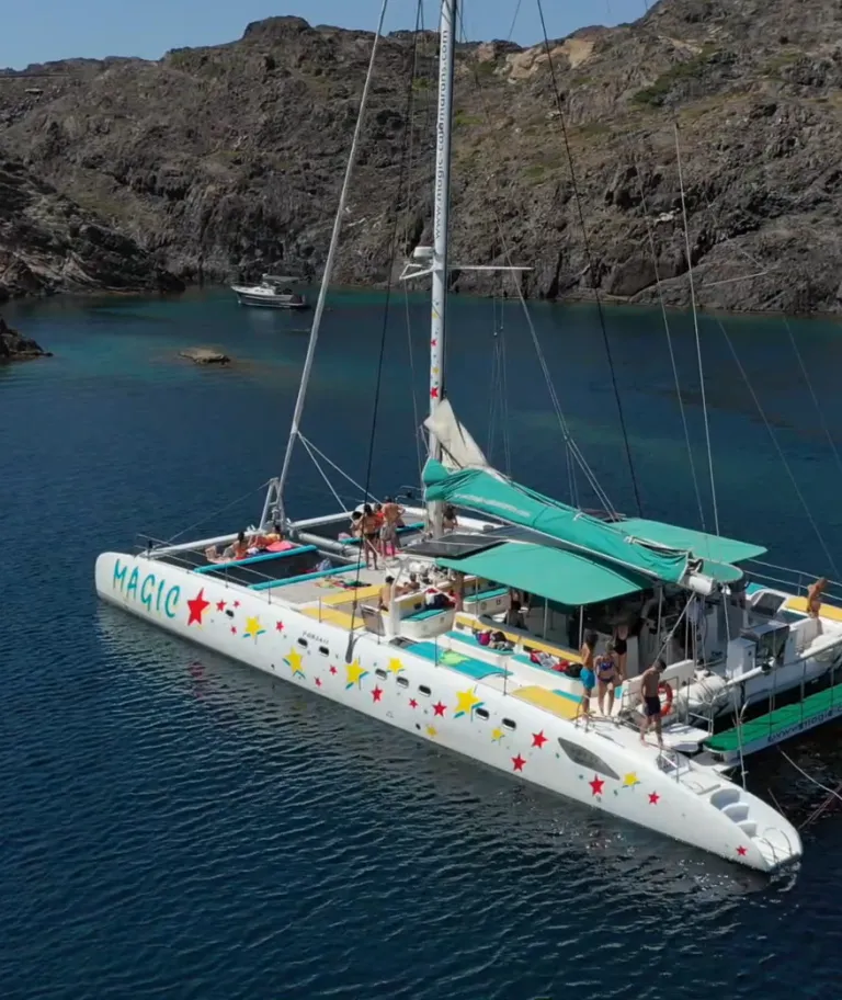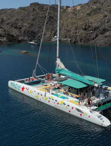 Enjoy an unforgettable sailing experience on board the MAGIC catamaran. Gliding gently over the blue waters of the Costa Brava, you will enjoy the silent sailing. We leave from the pier dels Ginjolers, in the center of Roses, and sail along the beautiful coast between Roses and Cadaquès with its lonely coves lined with pine trees and sharp cliffs to Cap de Creus, we pass through the famous village of Cadaqués and Port Lligat where the house of Salvador Dalí is located and we enjoy the spectacular rocky coast of Cap de Creus.