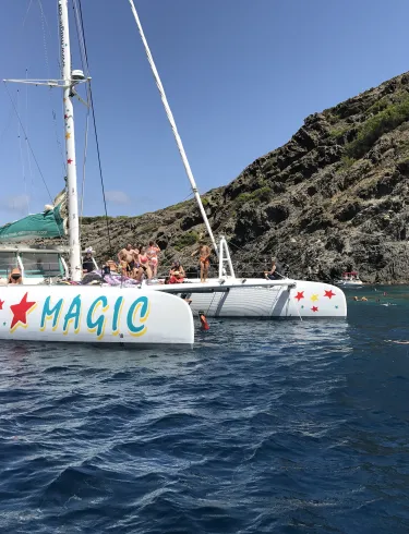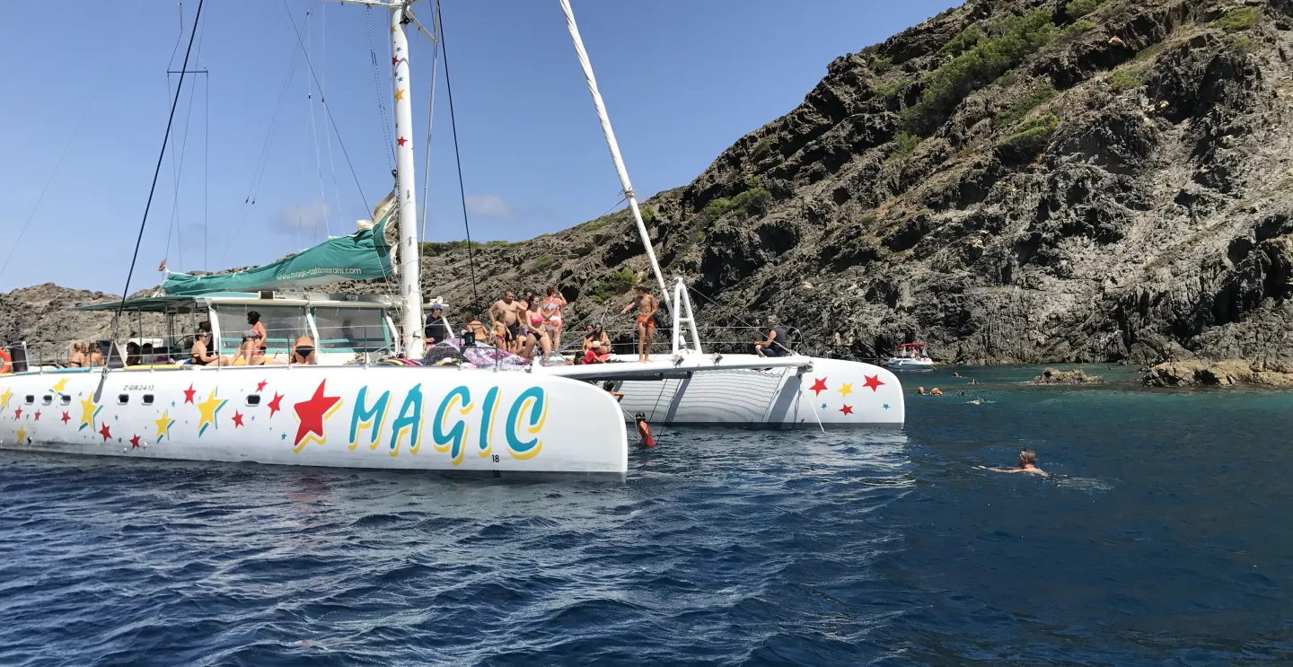 Enjoy an unforgettable sailing experience on board the MAGIC catamaran. Gliding gently over the blue waters of the Costa Brava, you will enjoy the silent sailing. We leave from the dock Ginjolers, in the center of Roses, and sail along the beautiful coast between Roses and Cap Norfeu with its lonely coves lined with pine trees and sharp cliffs.